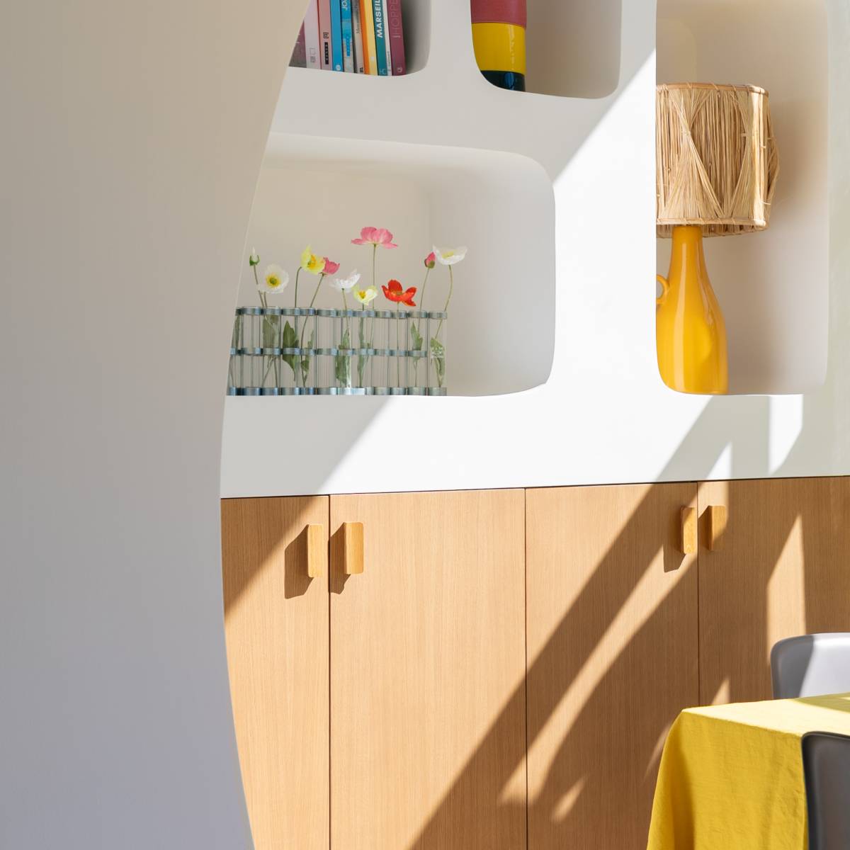 Les matériaux naturels, les teintes chaudes et le mobilier sur-mesure renforcent l’identité méditerranéenne de cette rénovation. Banquette maçonnée, rangements intégrés et buanderie discrète optimisent chaque mètre carré.